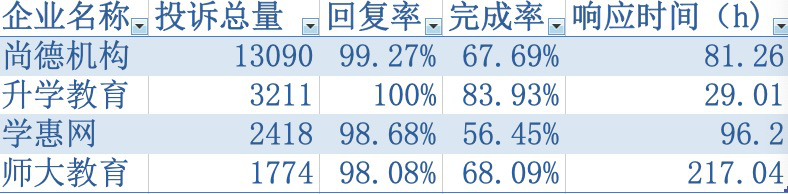 就在一天前,刘巧在网上看到了黑猫投诉发布的一则数据《教育行业主流学历提升教育企业投诉数据对比情况》。其中,尚德机构上万的投诉量,让原本打算报名专升本自考班的刘巧打起了退堂鼓。