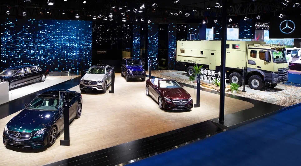 据界面新闻记者了解,今年戴姆勒展台面积达700平方米。在乘用车方面带来了梅赛德斯-迈巴赫S 680普尔曼、梅赛德斯-奔驰E 300轿跑车、梅赛德斯-奔驰E 260敞篷轿跑车、梅赛德斯-奔驰G 350和梅赛德斯-奔驰GLE 450 4MATIC轿跑SUV等车型。在卡车方面,则带来了基于梅赛德斯-奔驰8x8卡车底盘阿洛斯(Arocs)打造的全地形豪华旅居车。