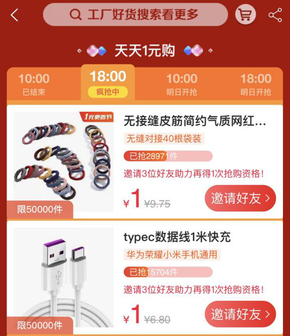目前,「天天一元购」版块每天上架8款左右的商品,一元包邮,限时限量抢购,但是对于消费者的购买次数有一定的限制,当用户下完一单之后,无法继续下单,除非邀请3位好友助力,才能获得继续下单的资格。