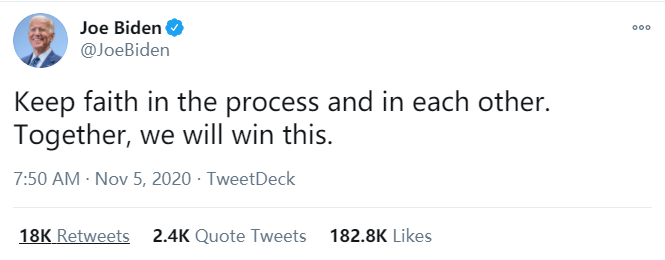 11月5日消息,民主党总统候选人拜登在推特发文表示:“对过程和彼此保持信心。团结一致,我们将赢得这场胜利。”