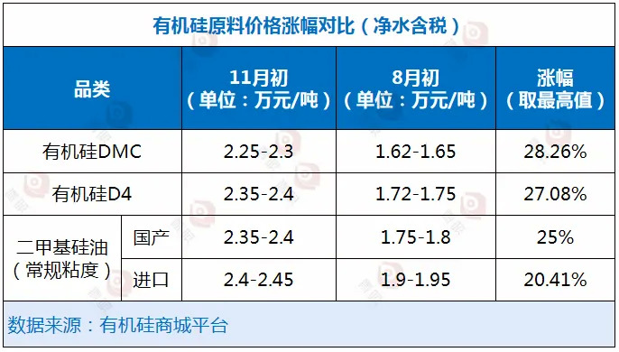 据青眼调查了解,有机硅价格在上半年触底后,从7月份开始反弹,经过反复探涨回调,价格稳步上移,最终在10月底迎来爆发式上涨。其中,有机硅DMC价格接近2.4万元/吨,对比8月初最高1.68万元/吨,每吨涨价近7200元,增幅将近30%。