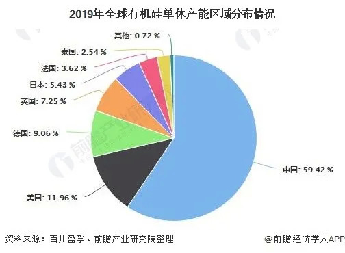 从产能区域来看,全球有机硅单体产能主要分布在中国、德国、美国、英国、日本、泰国和法国。近十年来,有机硅全球产能向中国国内转移趋势明显,我国已经成为有机硅的生产大国。2019年中国有机硅单体产能为328万吨(含外资和合资企业产能),占全球有机硅单体产能的比重达59.42%,位居全球第一位。