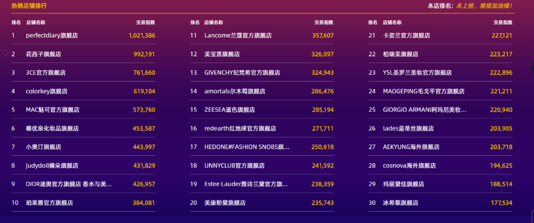 而彩妆类目天猫旗舰店交易指数排行榜中,完美日记居榜首,超越进口大牌魅可、阿玛尼等。