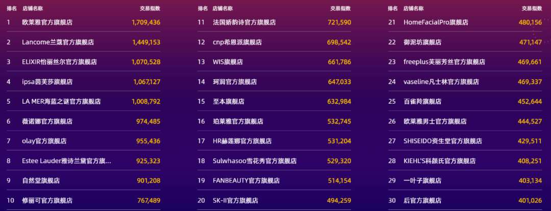 1. 据生意参谋数据显示,天猫双11开场半小时后,护肤类目天猫旗舰店交易指数排行榜中,欧莱雅、兰蔻、怡丽丝尔位列TOP3,国货品牌仅薇诺娜、自然堂入围TOP10,分列第6第9,此外,WIS、至本、珀莱雅、FANBEAUTY、HFP、御泥坊、百雀羚、一叶子等国货品牌也成功进入TOP30榜单。