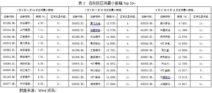 再来看看同期最小振幅的前十名情况。回调1.0和回调2.0之后振幅最小的个股幅度基本都在10%以上,而回调3.0之后振幅最小的10只个股的幅度均低于10%,可谓是“一潭死水”,最低的农业银行(601288.SH)甚至在11个交易日内只有4.50%的振幅,说它是“僵尸股”一点都不为过。这些“僵尸股”的波动幅度过小势必影响股市的赚钱效应,同时对于大多数套牢在其中的投资者来说,要想解套目前看来十分困难。