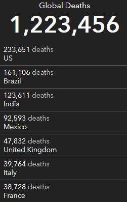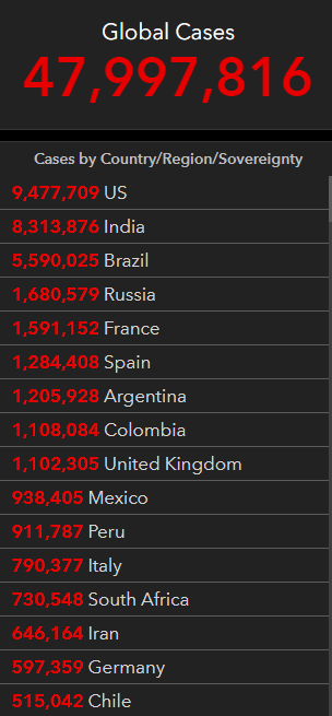 截至北京时间11月5日上午9点24分的数据显示,全球新冠病例已达47997816例,死亡病例1223456例。