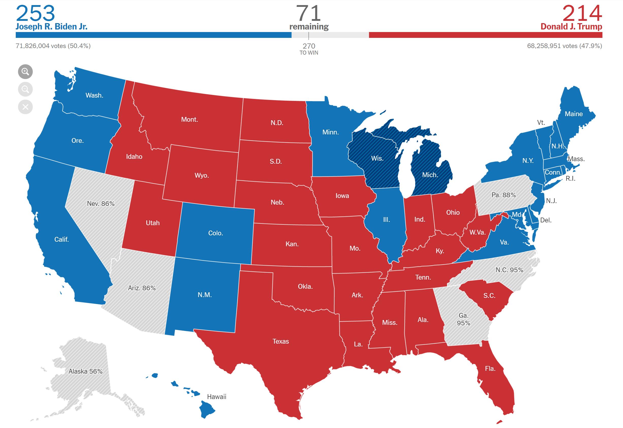 截至北京时间周四(11月5日)上午,民主党人拜登已基本确定将威斯康星州和密歇根州收入囊中。如果拜登最终赢下目前保持领先的内华达州和亚利桑那州,同时输掉特朗普目前领先的宾夕法尼亚州、北卡州和佐治亚州,那么他将以270票对268票的结果赢得大选。