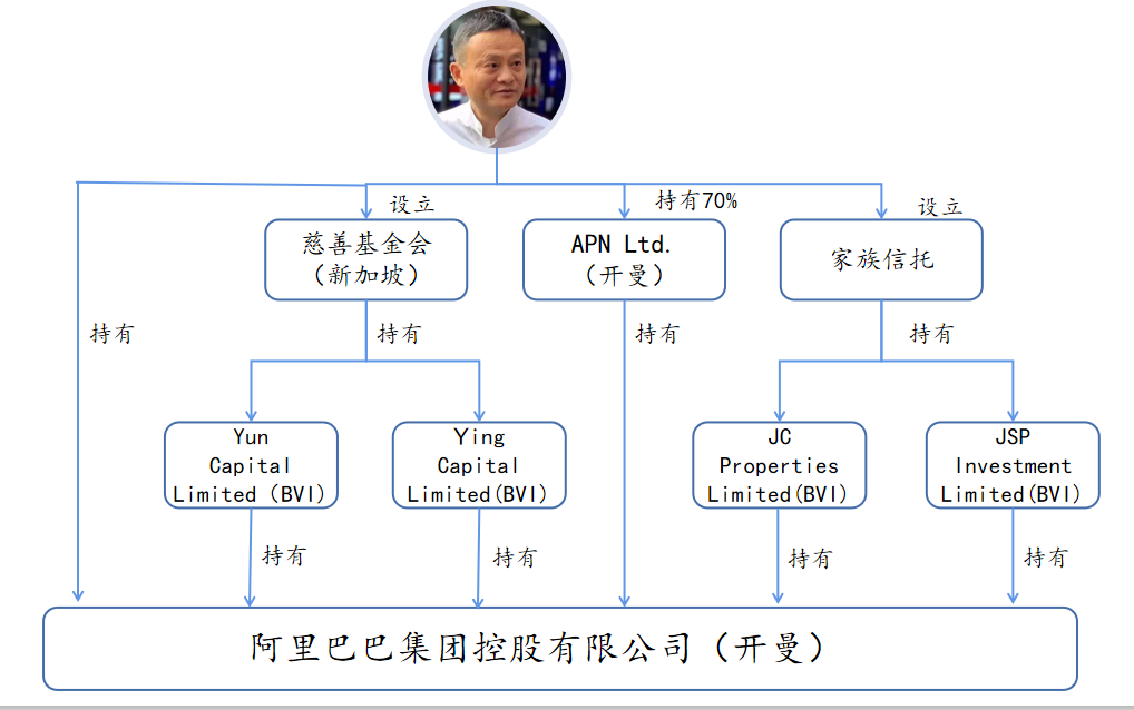 马云先生在新加坡设立了慈善基金会(The Jack Ma Philanthropic Foundation),用慈善基金会间接持有阿里巴巴开曼的股份。