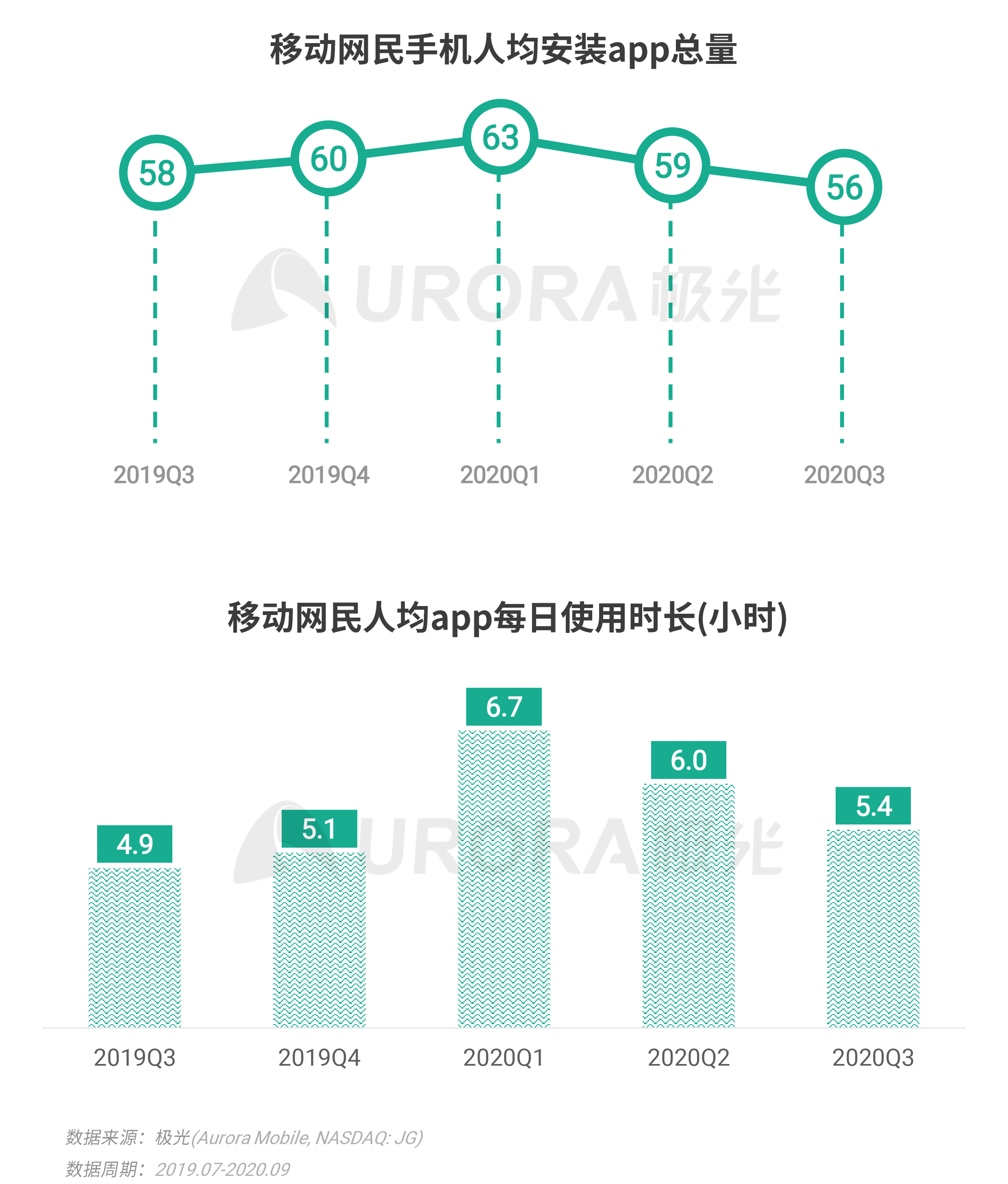 1. 第三季度,移动网民上网时长进一步回落:疫情防控形势向好,移动网民人均app安装总量下降至56款,人均单日app使用时长下降至5.4小时,但相对去年同期仍有0.5个小时的增长;