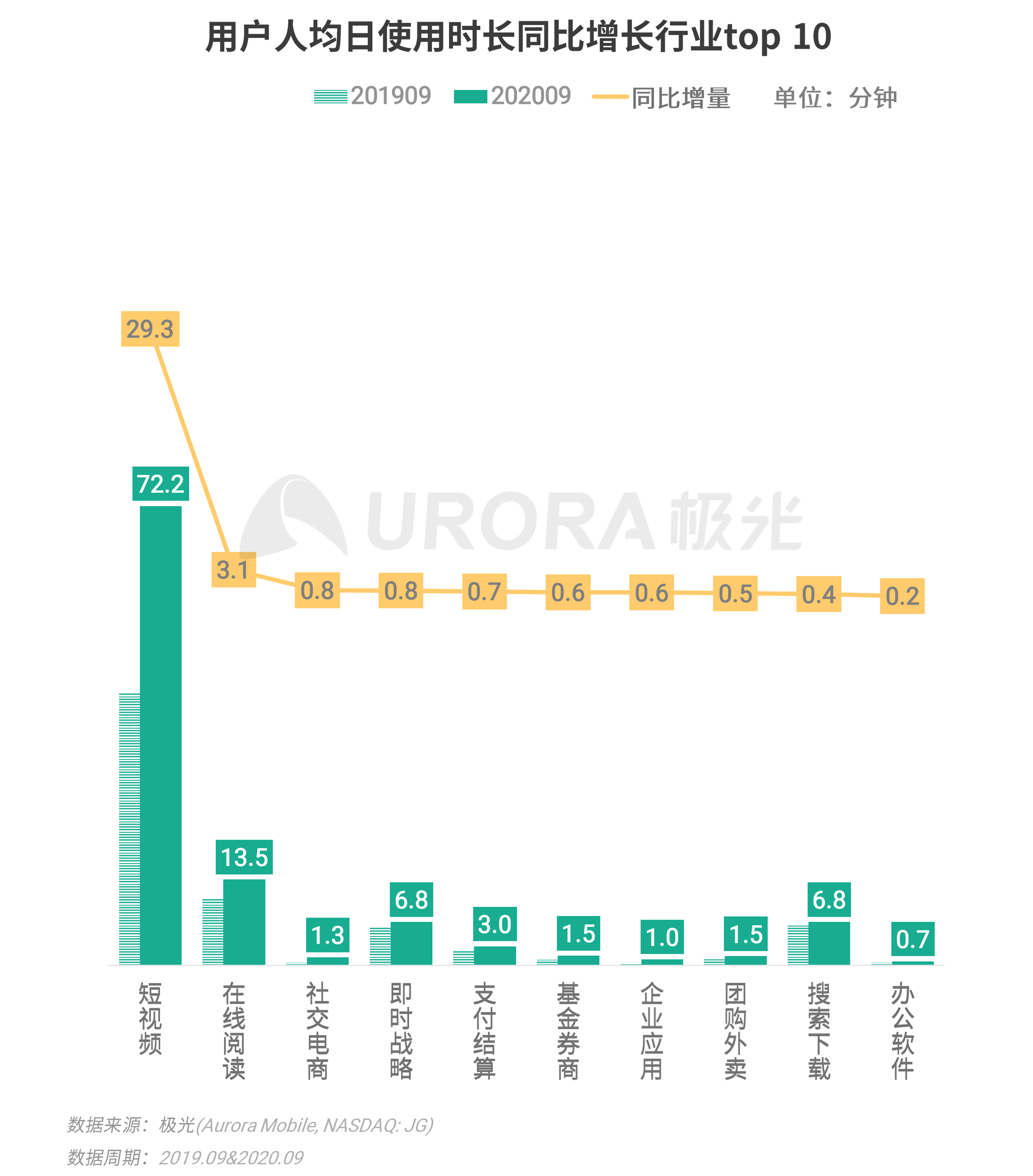 极光的数据显示,2020年9月,短视频行业的用户人均时长绝对值及同比增量均明显高于其他行业,人均每日使用时长超过1小时,较去年同期增长近半小时;此外,在线阅读、社交电商和即时战略类游戏也是用户时长同比增长较多的行业。
