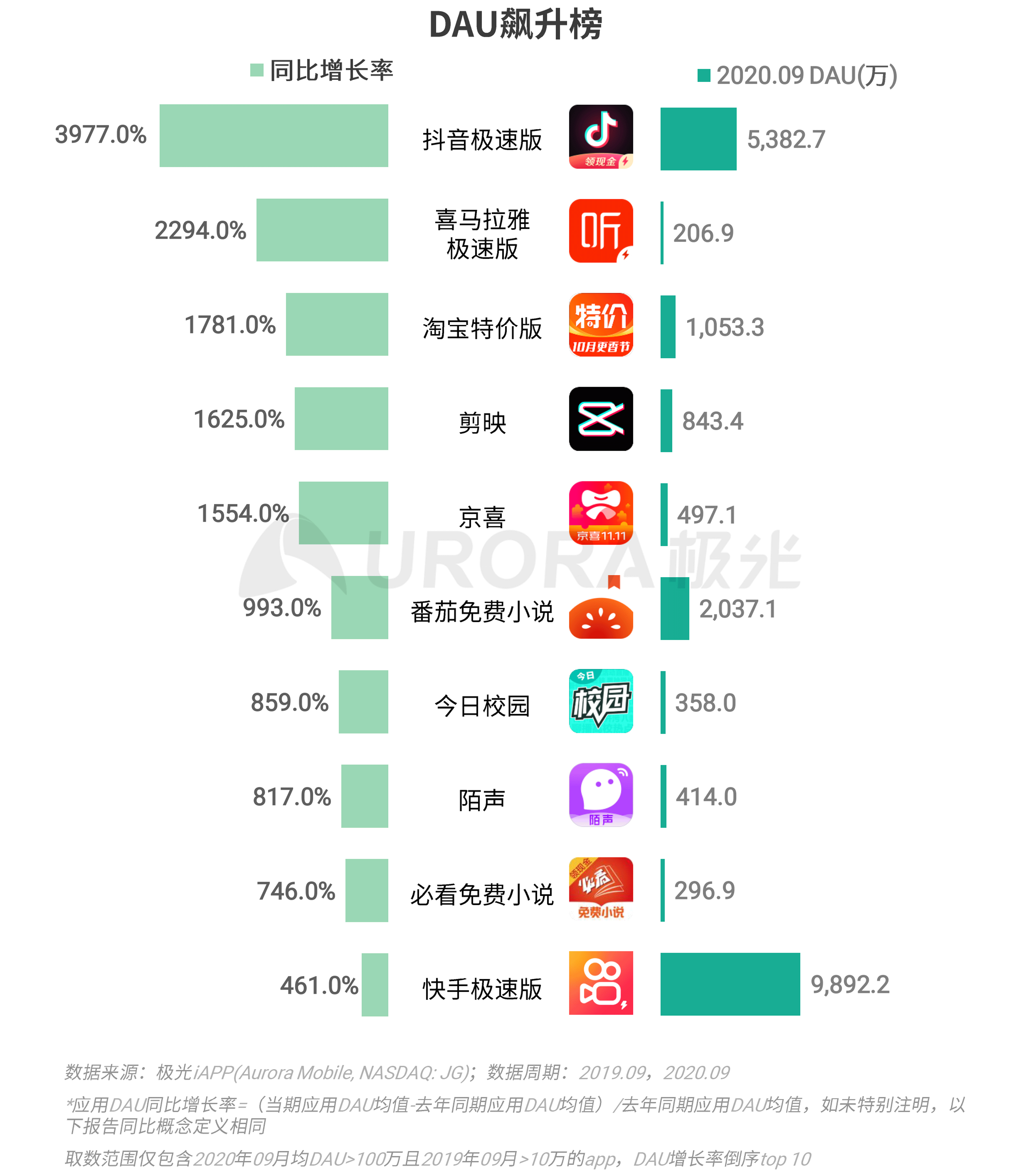 极光iAPP的数据显示,派生app是2020年9月的DAU飙升榜的最大赢家,抖音、喜马拉雅和快手的极速版app,以及淘宝系的淘宝特价版和京东系的京喜均上榜;排名第一的是抖音极速版,同比增长近40倍;另有,头条系的视频编辑app剪映位列第四名;番茄免费小说和必看免费小说两个网络小说类app也进入top 10。