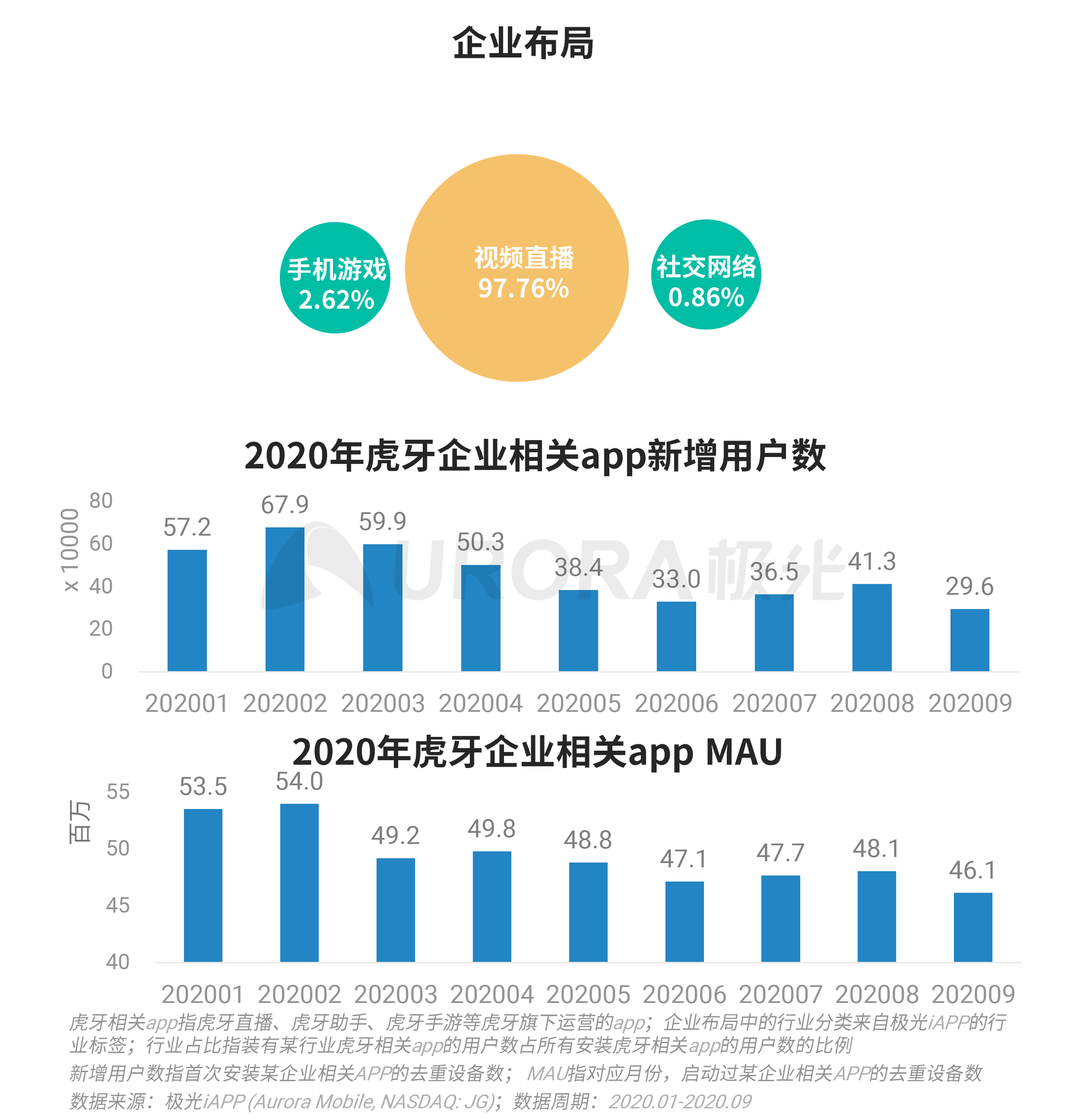 根据极光iAPP数据显示,虎牙企业以视频直播为主,用户占比达97.76%,在手机游戏和社交网络也有所布局。从新增用户数看,今年2月份是近期高点,达到67.9万,主要与疫情期间观看游戏直播的需求量上升有关;MAU方面,今年2月份是虎牙企业相关app的高点,达5400万;整体来看,疫情后虎牙月活用户有所降低,但整体影响有限。