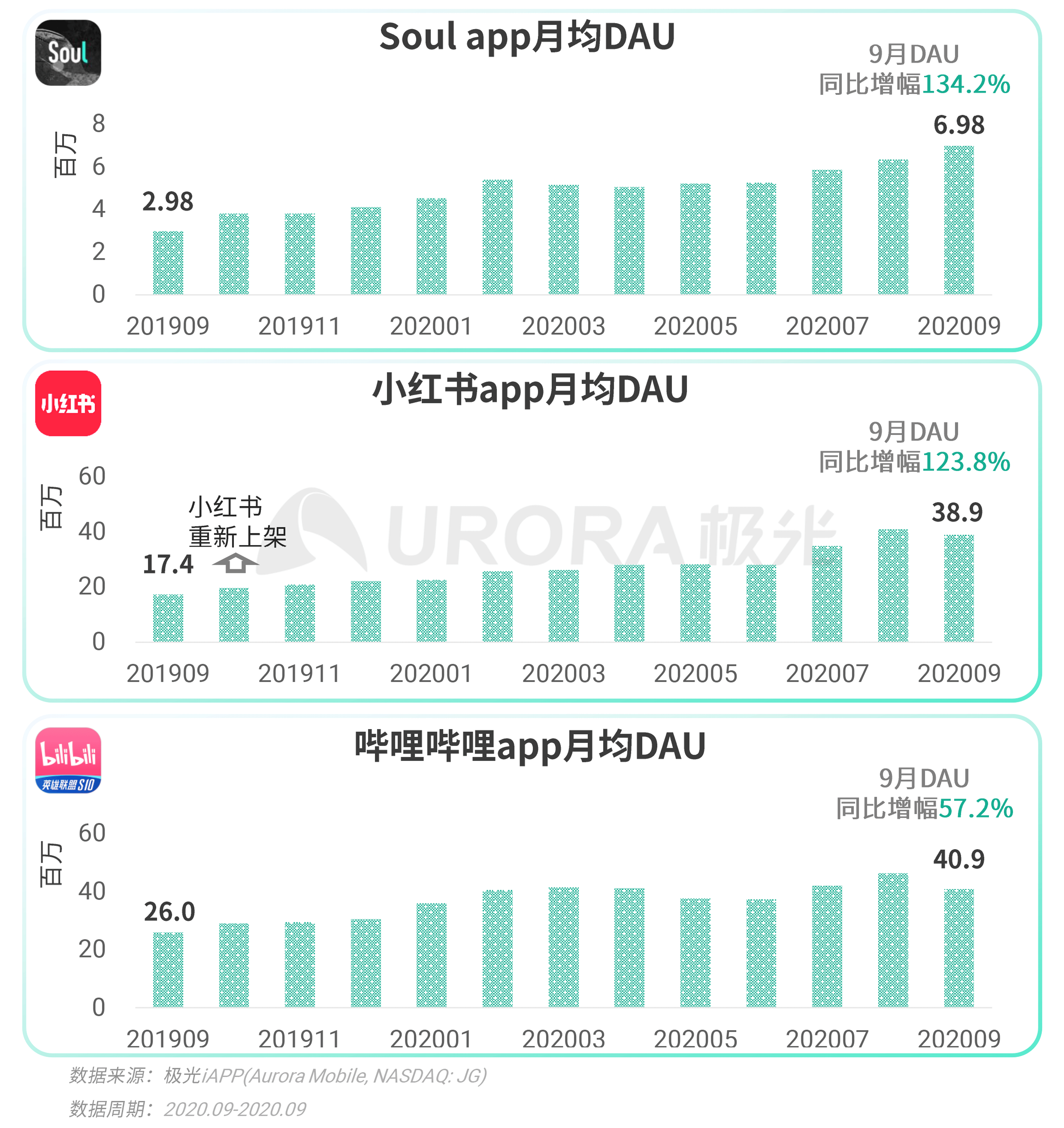 在运营表现方面,内容社区竞争优势显露,助力app持续增长。根据极光iAPP的数据显示,过去一年里,以Soul、小红书和哔哩哔哩为代表的一批聚集Z世代用户的内容社交社区运营数据持续稳步增长,进一步验证良好的内容社区运营对用户增长可以形成正反馈。Soul今年9月DAU均值近7百万,DAU同比增长率为134.2%,用户增长爆发能力显著;2019年10月重新上架的小红书今年9月DAU均值达到3890万,DAU均值同比翻倍;哔哩哔哩今年9月DAU均值超4千万,过去一年月均DAU同比增量接近1500万。