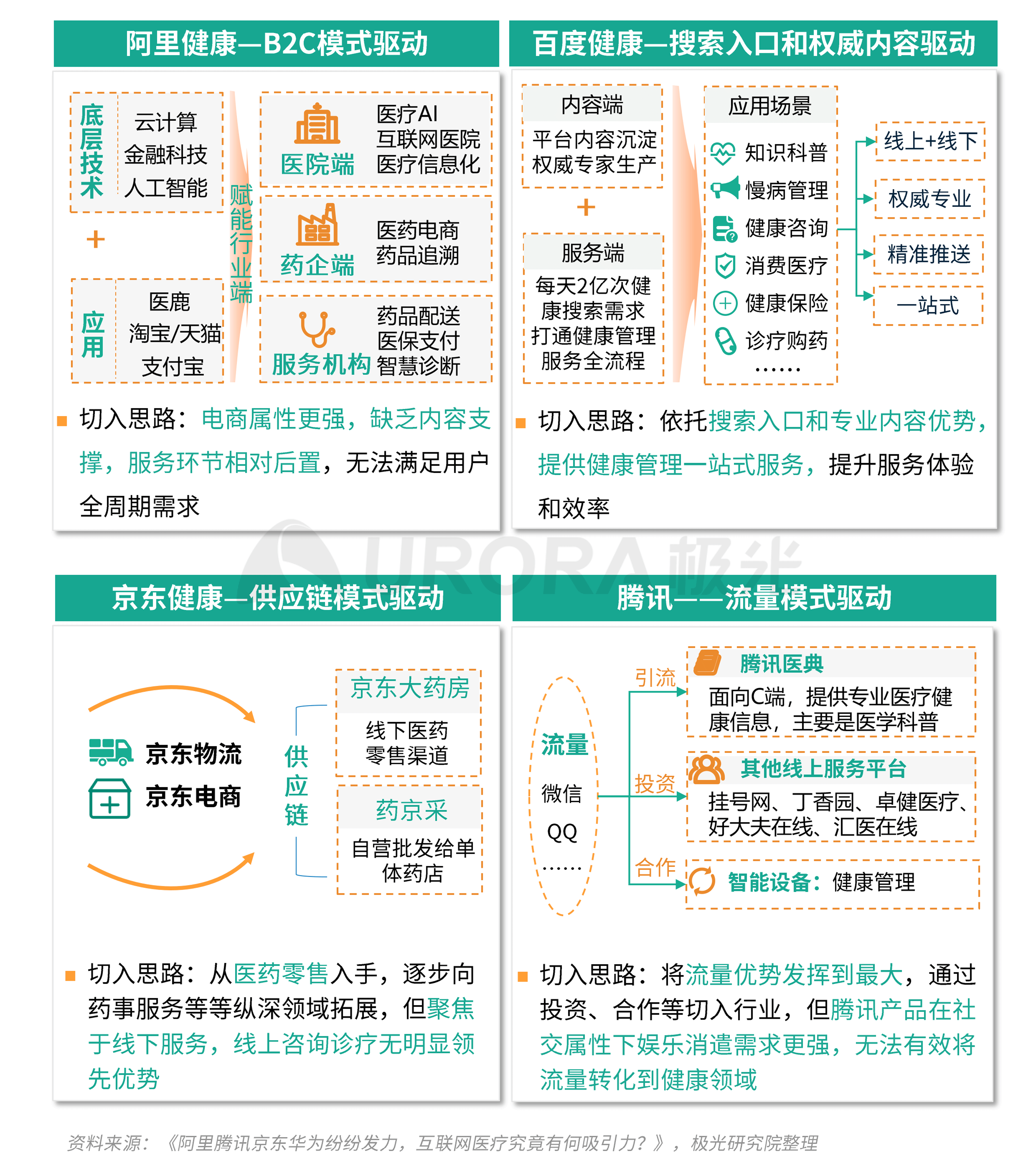 依托于自身原有优势和业务协同,互联网巨头以差异化发展路径入局医疗健康领域,整体而言,割裂的健康管理/诊疗服务流程在一定程度上获得了整合,医疗健康行业主体众多造成的诊疗效率低和就医体验差的问题有了可观的改善。