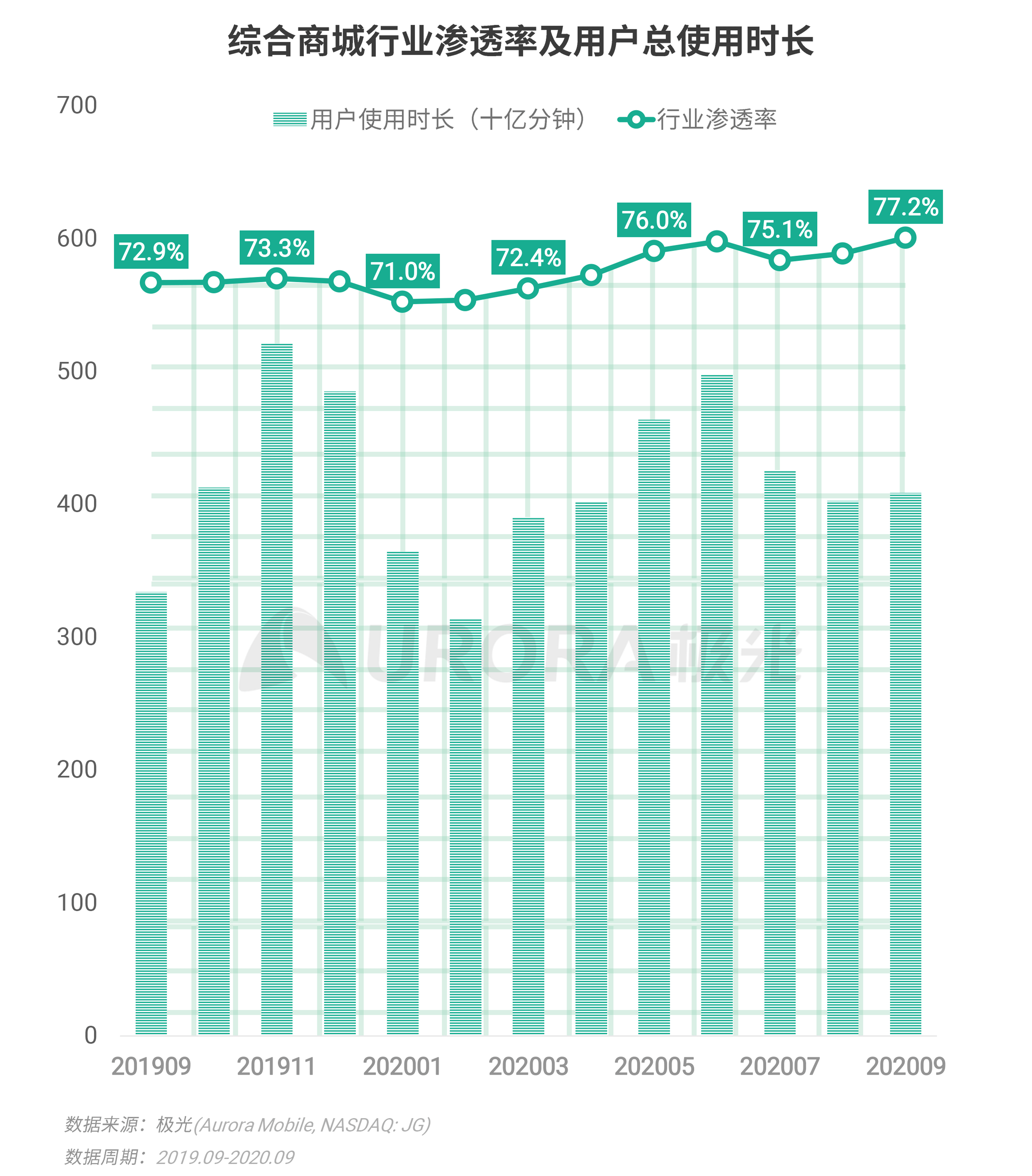 极光的数据显示,2020年第三季度,综合商城行业在经历了618的电商节后,渗透率有所回落,但在9月逐步回升,行业渗透率增长至77.2%,同比增长了4.3个百分点,用户使用时长同比增长率达22.3%。