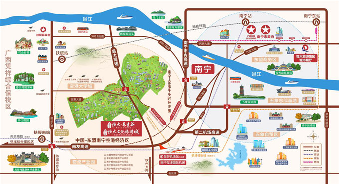 恒大的“巨无霸”文旅康养项目位于南宁市空港经济开发区空港大道88号,占据多维立体交通枢纽。