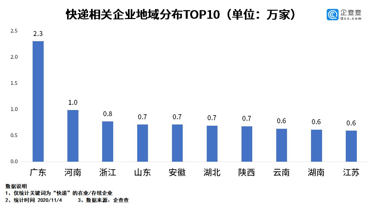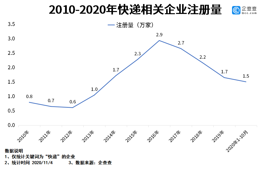 企查查数据显示,2020年前三季度,我国快递企业一共新注册了1.4万家,同比增长16.7%。其中,第一季度注册量是0.3万家,第二季度注册量是0.6万家,第三季度注册量是0.5万家。