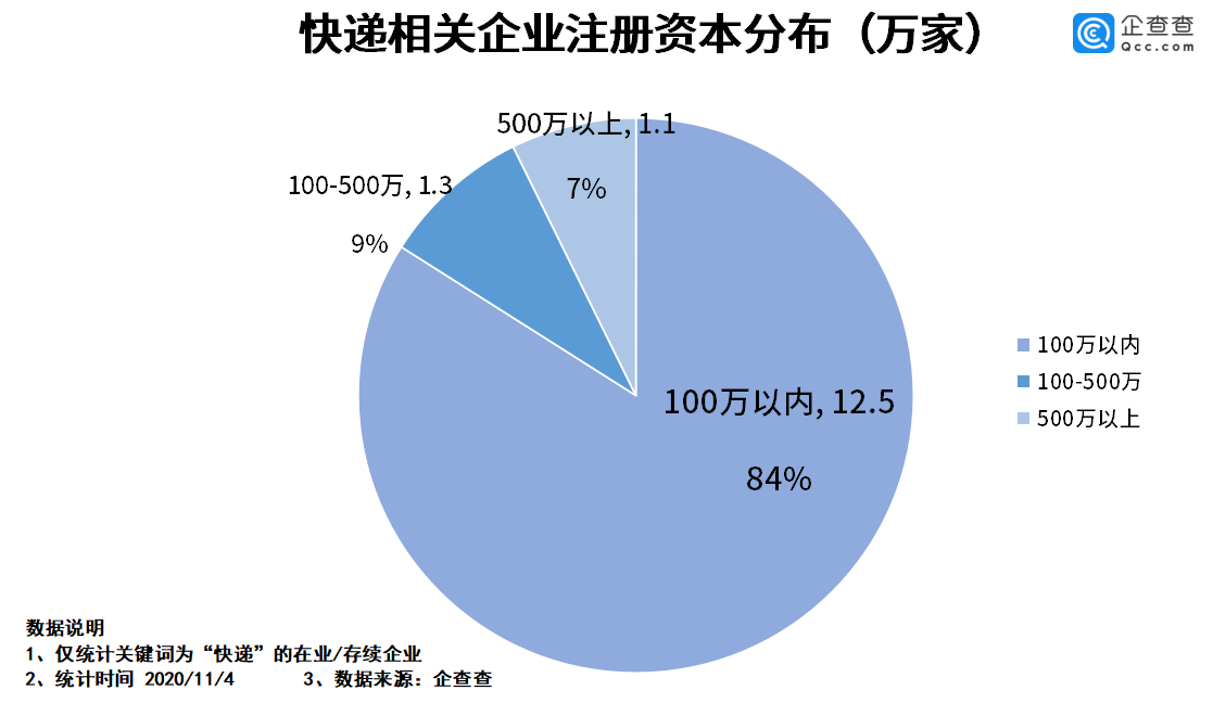 从企业规模来看,企查查数据显示,目前企业注册资本在100万以内的快递企业有12.5万家,占比企业总量的84%。企业注册资本在100万以上的企业有2.4万家,占比16%。