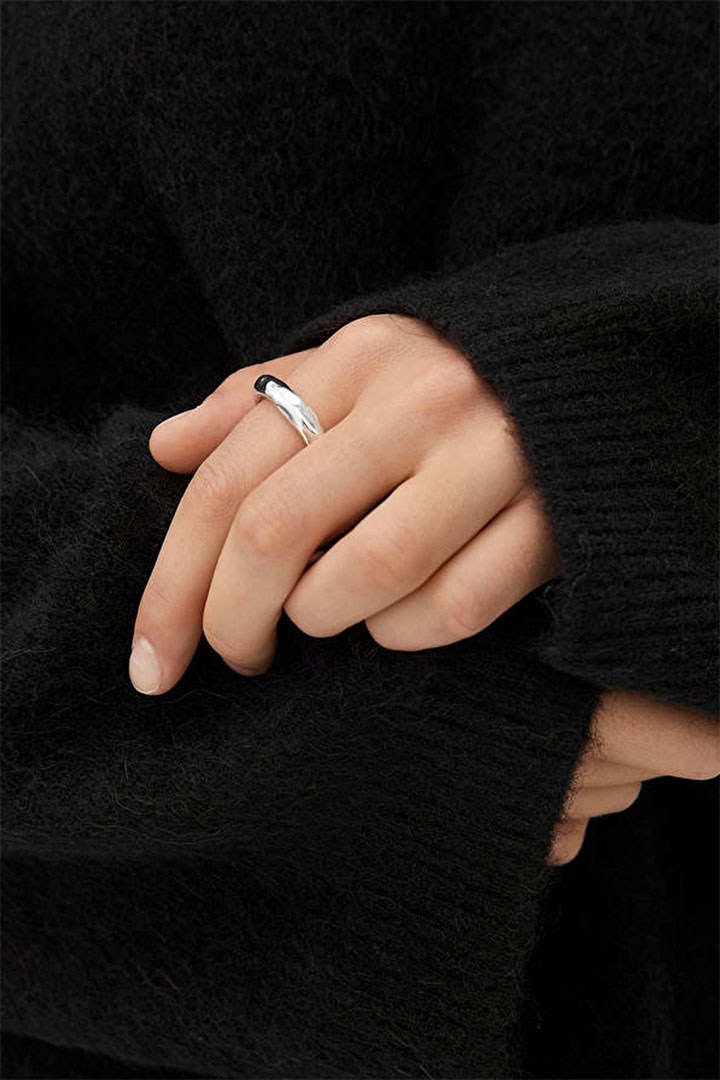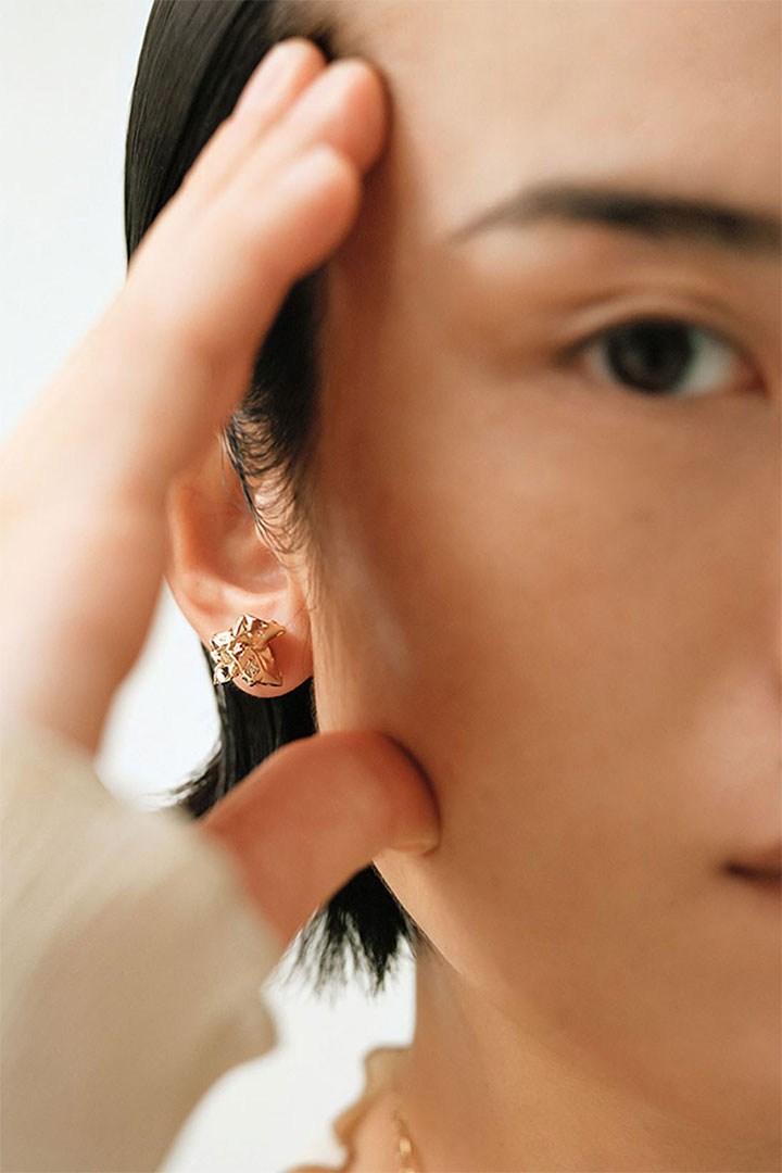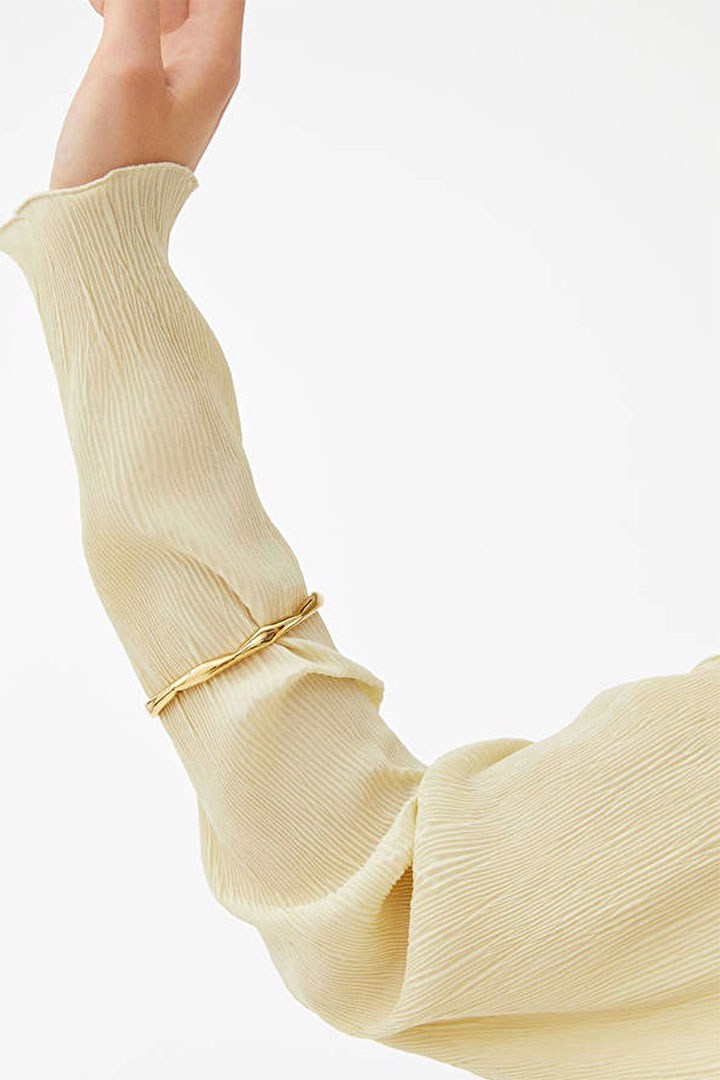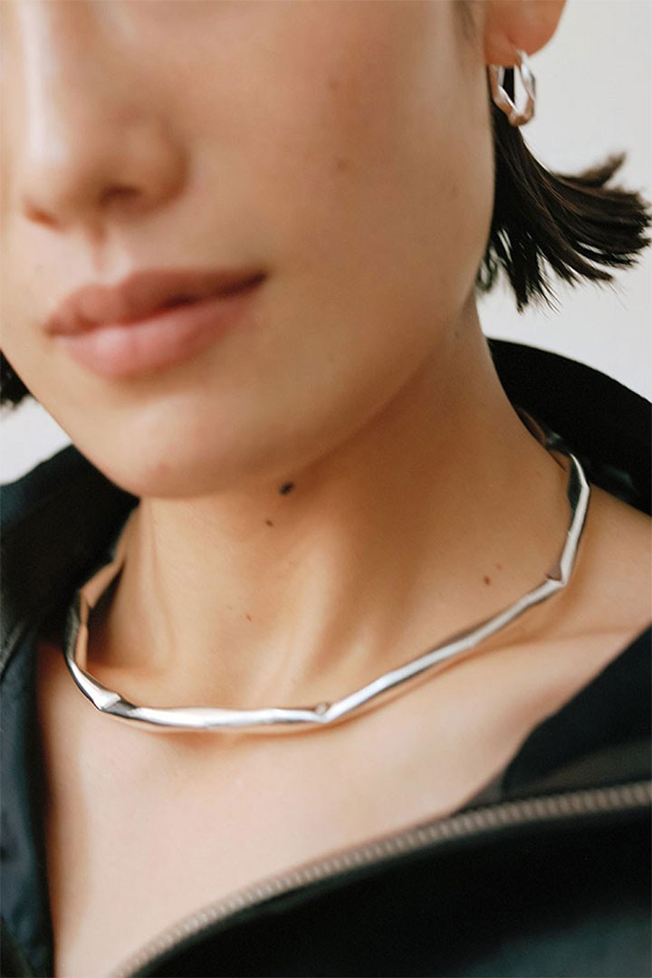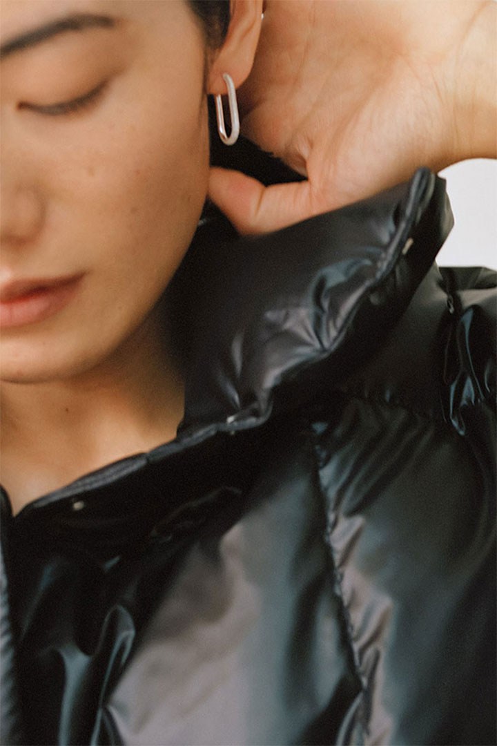 纯色的金银色饰面简约高级,所有饰品的造型设计也并不复杂,仅仅在耳饰、项链、戒指等饰品上作了褶皱设计,这样每款单品既可独立佩戴,也可和其他单品搭配叠合,打造出不同的风格。系列的项链吊坠以及部分耳钉则作了不规则的立体设计,这与Lucio Fontana画作的三维空间概念遥相呼应。简约也是留白,ARKET在创作的同时也将更多想象空间留给佩戴者们。
