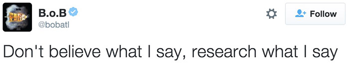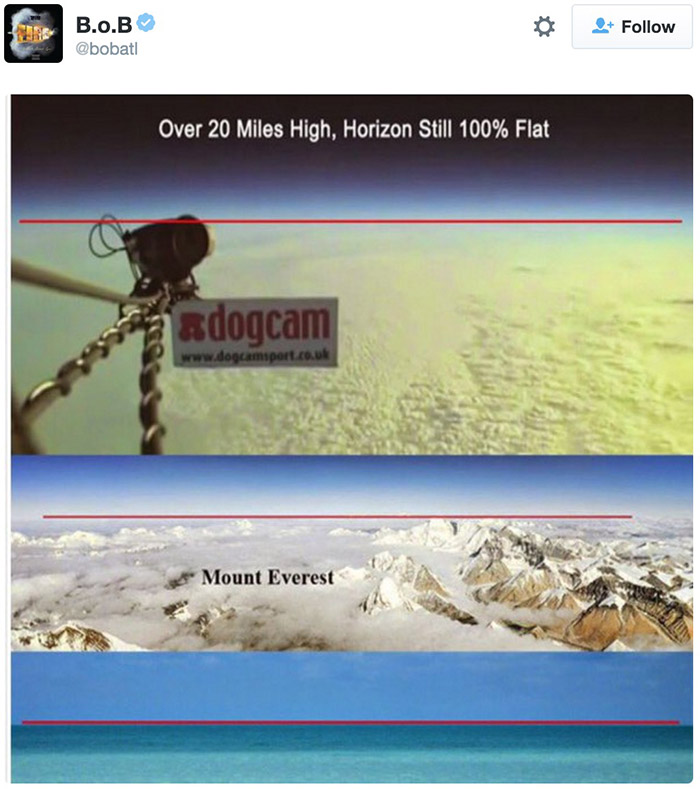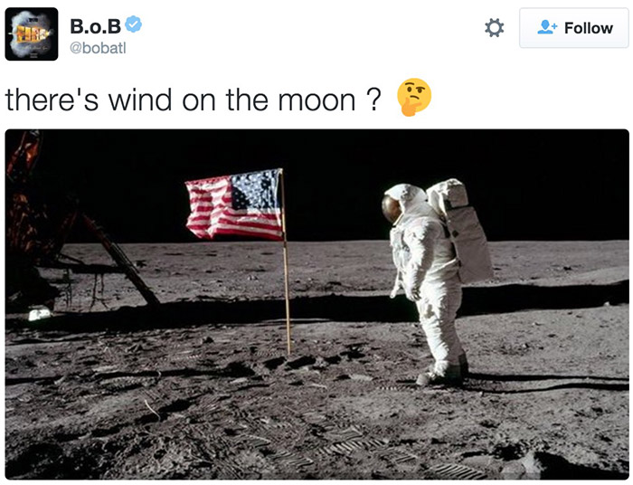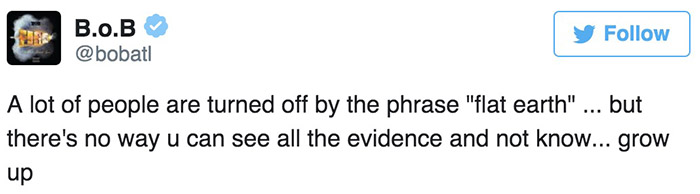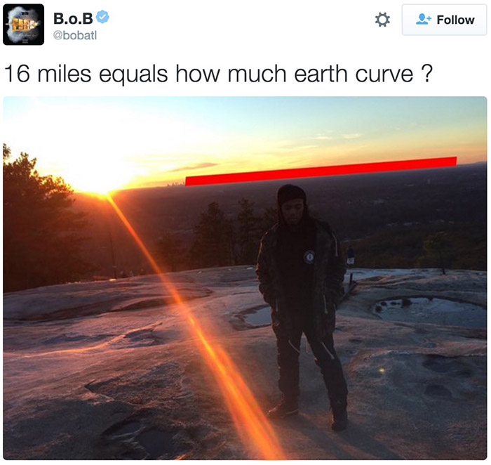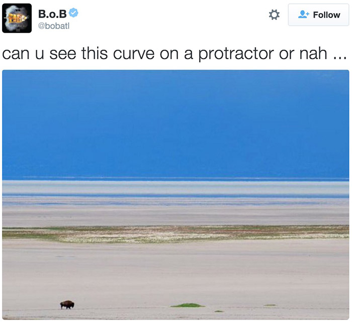 今天凌晨,著名说唱歌手BOB在Twitter上提出了一个类似阴谋论的观点:地球其实不是球体而是平的。“许多人都被‘天圆地方’的概念吓怕了,但证据摆在眼前你不得不承认这点。”