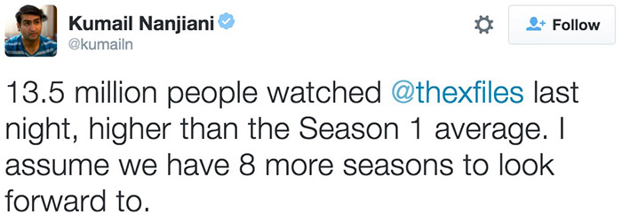 美剧《硅谷》主演库梅尔·南贾尼在Twitter上表示,有一百三十五万观众收看了回归的《X档案》第一集,比1993年第一季的平均收视还高。