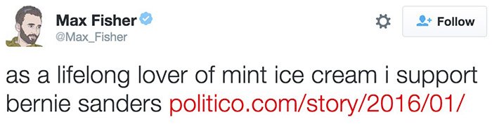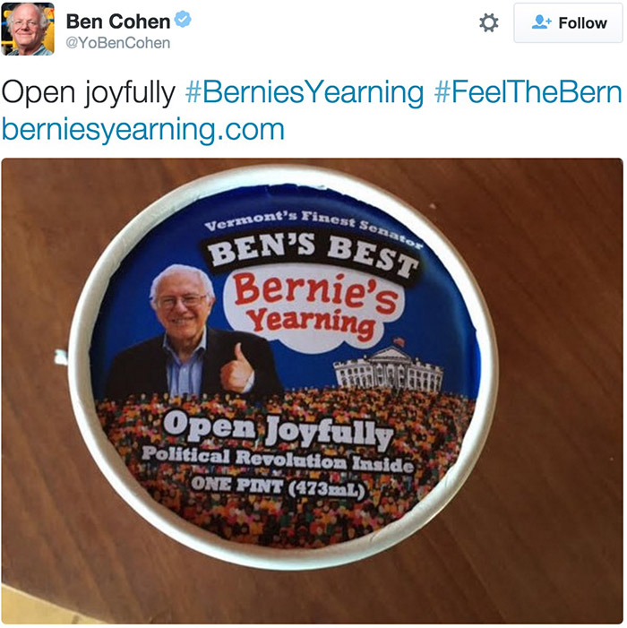 关于美国大选,我们已经说了太多川普和希拉里的段子,而看起来最靠谱的候选人伯尼·桑德斯在抢头条这件事上一直非常安静。但这并不代表伯尼粉丝少,美国著名冰淇淋公司Ben & Jerry's的创始人Ben Cohen就是伯尼的头号粉丝,在他的推动下,Ben & Jerry's推出了一款“伯尼口味(Bernie's Yearing)”的冰淇淋:薄荷冰淇淋上盖了一层牛奶巧克力硬壳,就像伯尼一样好吃(卧槽我在说什么)。