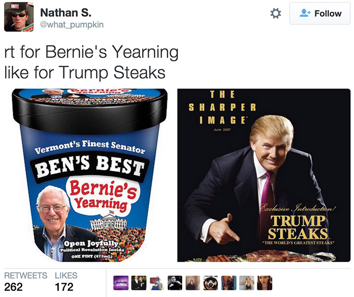 两党粉丝迅速展开了站队活动:“支持伯尼冰淇淋请转发,支持川普牛排请点赞。”