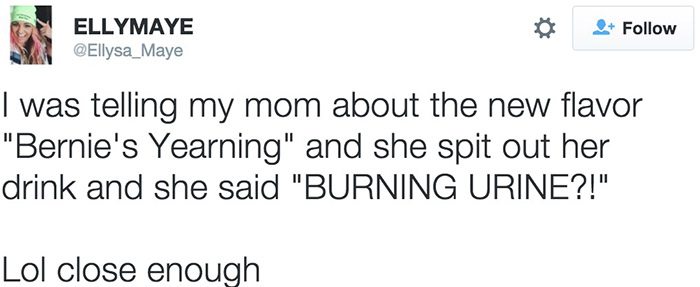 “我刚才告诉我妈新口味的冰淇淋叫“Bernie's Yearning”,我妈立刻喷了一屏然后说‘啥?燃烧的尿?!’……”