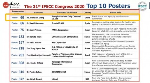 (TOP10上榜第一排,中国唯一化妆品企业获奖:百雀羚科学家张文娟荣获2020年第31届日本横滨IFSCC全球化妆品科技联盟大会TOP 10十佳海报奖:获奖论文题目“通过独创数学模型和皮肤中的自发荧光物质预测肌龄”。)