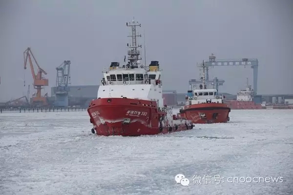 港口被冰封住,破冰船艰难开航。后面2条船上几十名倒班员工的春节要在海上过了。他们说这是平台人的春运。