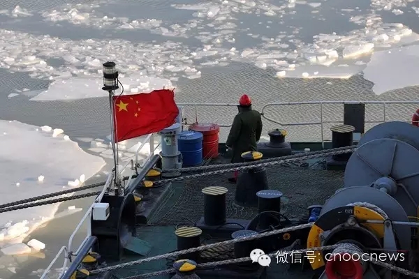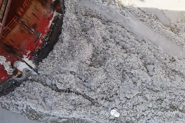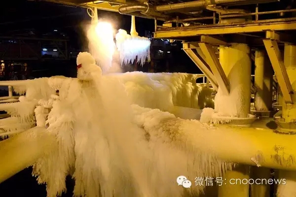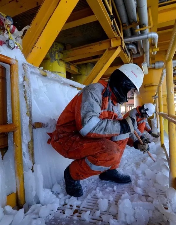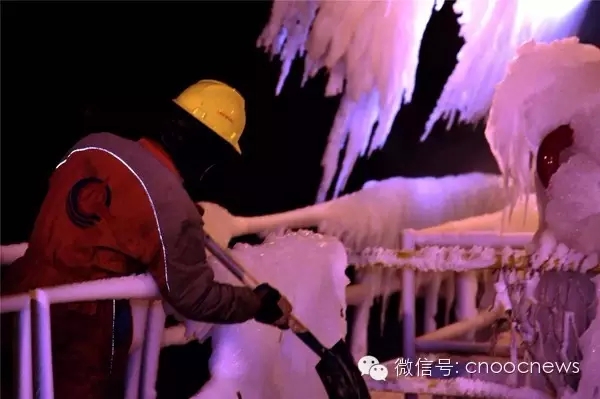 夜,8级大风,体感温度超过零下30摄氏度。海冰又爬高了5、6米,海上员工正奋力挥动着铁锹。