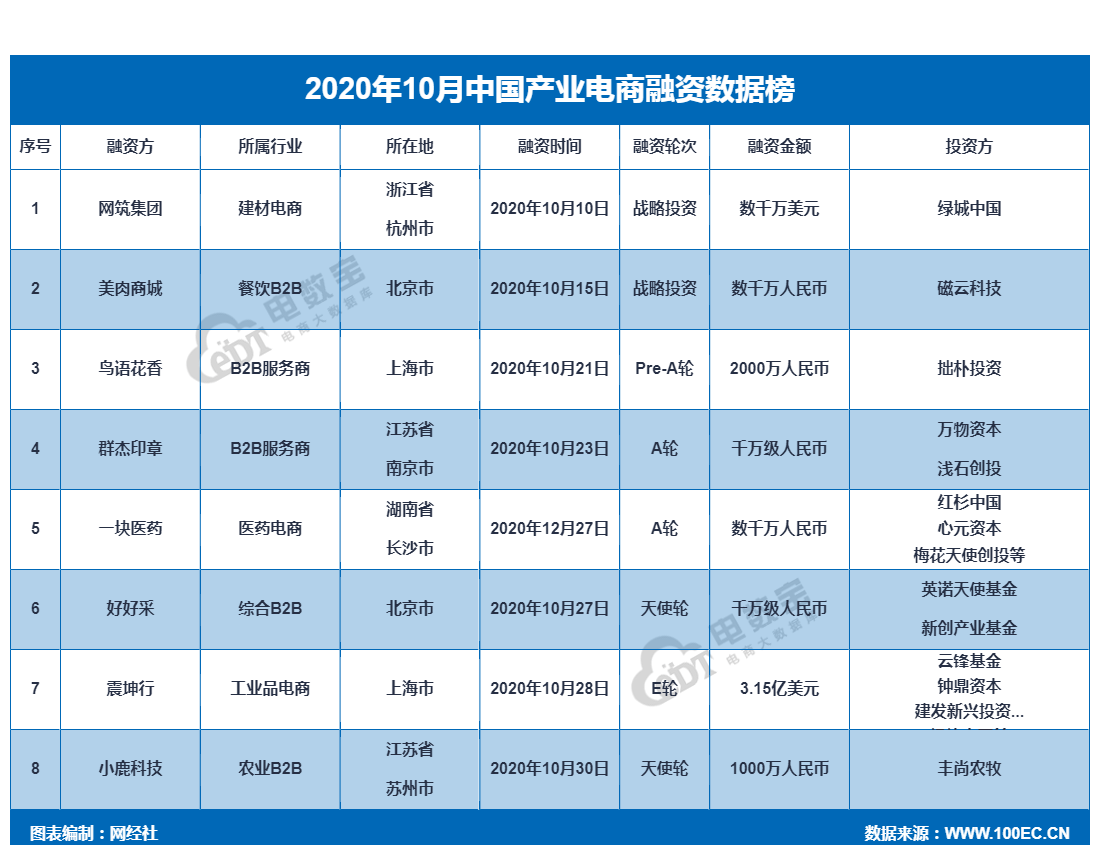 11月2日,网经社电子商务研究中心发布《2020年10月中国产业电商融资数据榜》。据网经社“电数宝”(DATA.100EC.CN)电商大数据库显示,2020年10月产业电商领域共有8家平台获得融资,分别是小鹿科技、震坤行、好好采、一块医药、群杰印章、鸟语花香、美肉商城、网筑集团,融资总额超23.8亿人民币。