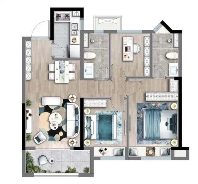 建面约89㎡户型:三房两卫两卫