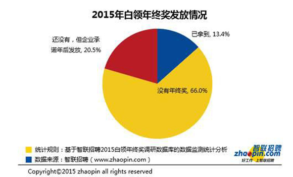 报告显示,在参与调查的白领中,已拿到年终奖的人数比例仅占13.4%,20.5%受访者表示企业承诺年后发放。也就是说,2015年仅有1/3的白领能拿到年终奖;而相对2014年总体均值为13613元的年终奖,2015年年终奖的总体平均值仅为10767元。