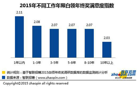 工作一年以内的白领对年终奖的满意度水平最高,为2.11, 工作1-3年的白领对年终奖的满意度指数为2.08, 而10年以上工作年限的白领年终奖满意度指数仅为2.03。这可能与满意度水平和期望水平的相关程度有关,刚参加工作的职场新人们可能对自己是否能拿年终奖并不抱有较高期望,因此只要能拿到,就会“心满意足”了,而工作时间较长的白领,对年终奖的期望较高,如果拿到的数目不及自己的预期,可能失望的程度较高,满意度水平也就下降了。
