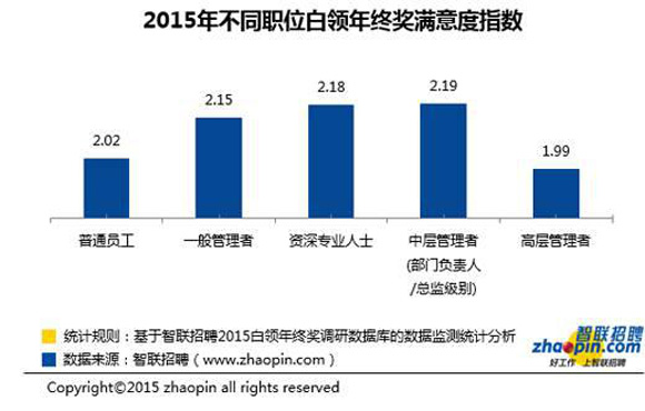 不同职位的白领年终奖满意度数据也可以作为反例。中层管理者和资深专业人士的满意度水平较高,而两头的普通员工和高层管理者满意度指数较低,尤其是高层管理者,尽管他们的年终奖均值最高(2.3万元),但他们的满意度水平最低。