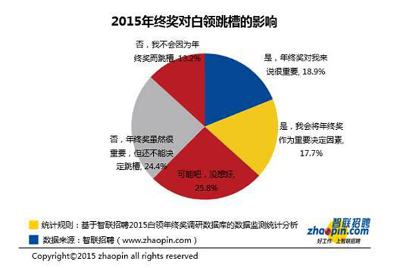 调查显示,虽然年终奖是白领整体收入中比较重要的组成部分,但相比2014年,年终奖对白领跳槽的影响程度略有下降。在他们衡量一家公司的薪酬福利水平时,年终奖的重要度指数为3.71,2014年重要度指数为3.80。