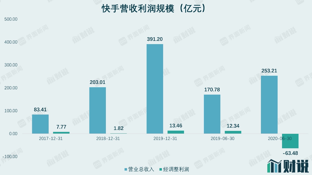 2017年、2018年、2019年,快手营收分别为83.4亿元、203亿元和391.2亿元,复合增速为116.5%。2020年上半年,公司营收达到253.2亿,同比增长48%。