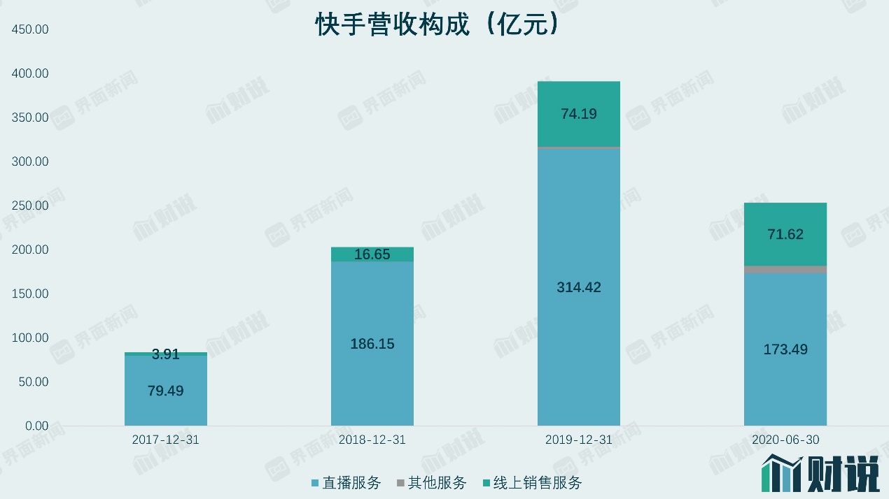 目前来看,快手的主要营收分为三部分,分别是直播、线上营销服务以及其他业务。其中,2020年上半年,直播以及线上营销业务的收入分别占了营收的68%以及28%。可以说,快手赚钱目前主要依靠的还是直播。2019年度,快手直播收入达到314.42亿元人民币,2020年上半年,直播业务为173.49亿元。