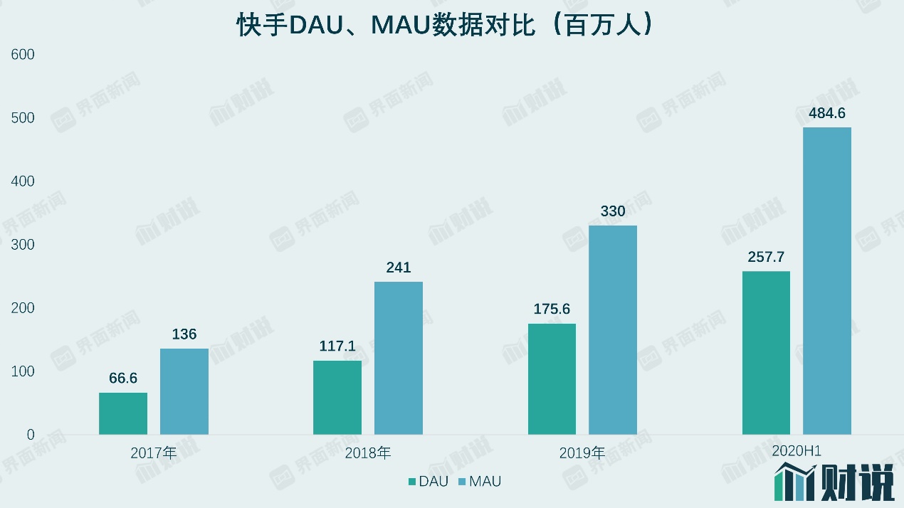 2017年、2018年、2019年,快手平均月活跃用户分别为1.36亿、2.4亿和3.3亿,复合增速为55.7%,2020年上半年,公司平均月活跃用户进一步增长到4.8亿。