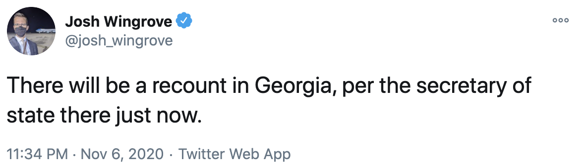 据彭博白宫记者Josh Wingrove刚刚消息,据佐治亚州州务卿的说法,该州将重新计票。
