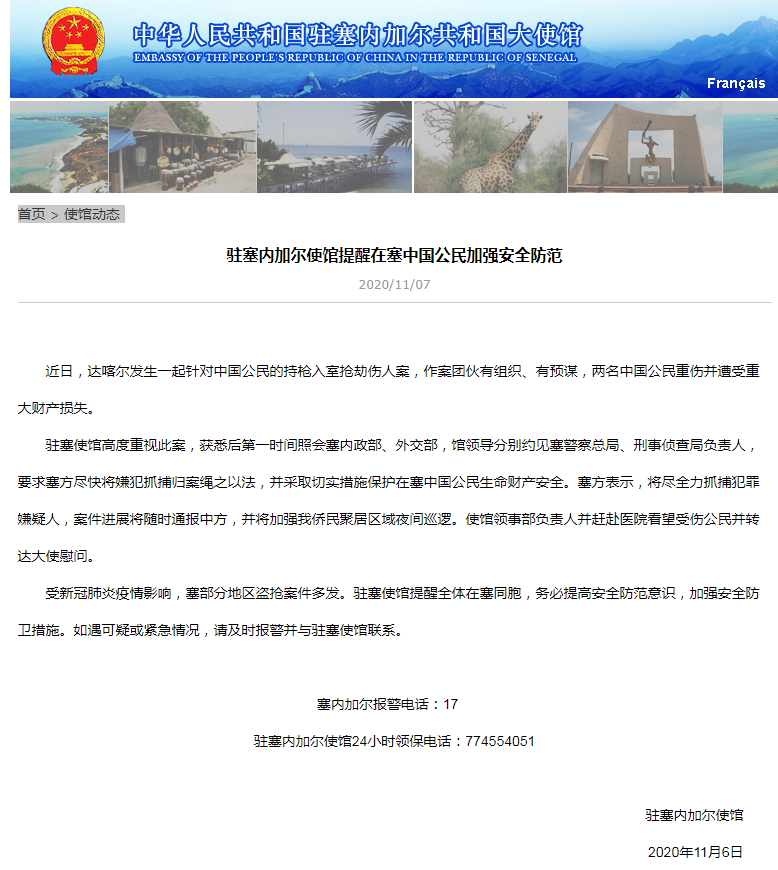 中国驻塞内加尔大使馆网站11月7日消息,近日,达喀尔发生一起针对中国公民的持枪入室抢劫伤人案,作案团伙有组织、有预谋,两名中国公民重伤并遭受重大财产损失。