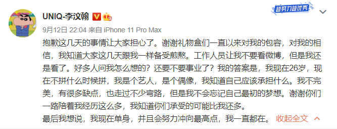 如果还是不幸“踩雷”了,一定要抓住黄金时间进行舆论公关,诚恳的认错补救挽回网友的好感。同时经纪公司也要评估问题的性质与严重程度,必要的时候可以“壮士断腕”及时止损,不久前乐华娱乐就劝退了旗下涉嫌“大尺度聊天”的未成年艺人张铭浩。