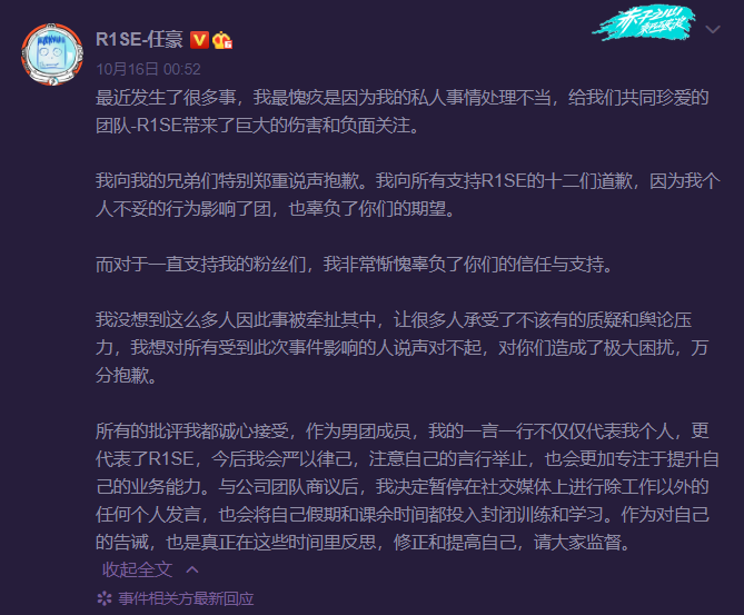 第四,国内偶像行业如此旺盛的人才需求,造成了整个市场对失格的偶像过于宽容,完全没有震慑力度。如果说韩国“流水线”的练习生打造模式太过压抑偶像的自我,让他们外在被规训的礼貌亲切,内里却逐渐心态失衡,从而翻车。国内的市场生态则容易让偶像们太过于放飞自我,大部分经纪公司的管束十分宽松,龙丹妮曾经在节目上直言并不会严格限制旗下艺人恋爱,任豪的“海王事件”发生后惩罚措施也只是不痛不痒的停工90天,再加上不分青红皂白忙着帮爱豆说话“洗地”的粉丝,都造成了偶像们更加的有恃无恐。