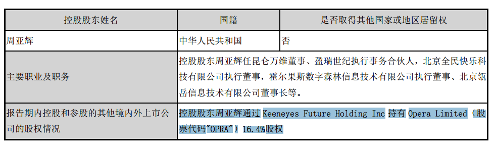 需要注意的是,此次香港万维的股权交易方为KFH,而KFH的实际控制人实为周亚辉,截至2019年末,周亚辉通过KFH持有Opera 16.4%股权。