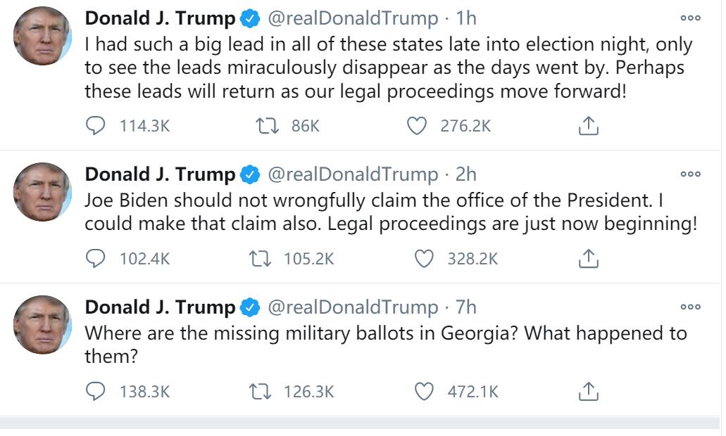 当地时间周五,特朗普继续在推特抱怨计票和选举: