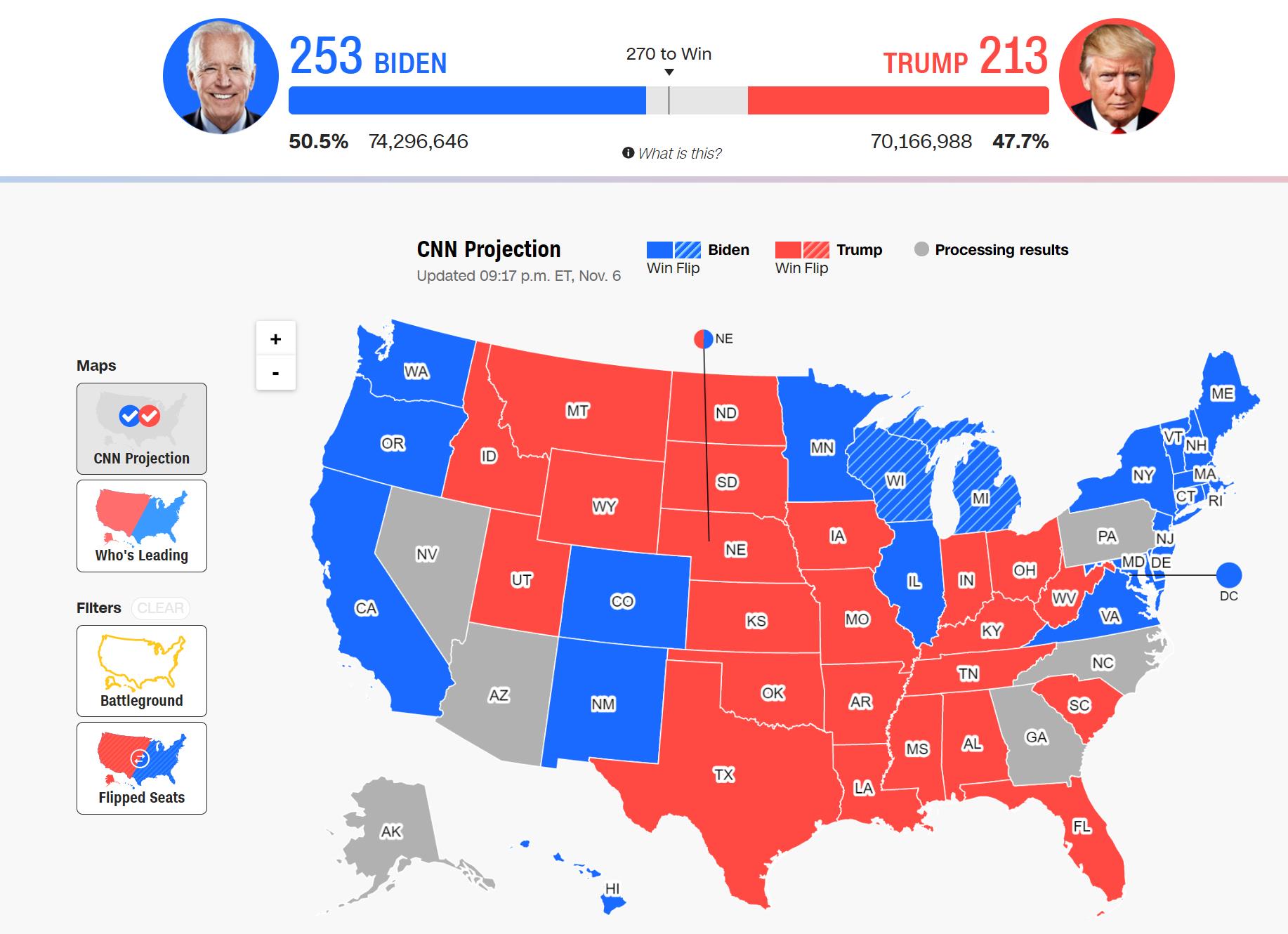 周五早些时候,拜登在佐治亚州实现反超。但在99%选票统计完成后,两位候选人得票率均为49.4%,拜登仅领先特朗普4000张票。佐治亚州州务卿已宣布本州计划重新计票。
