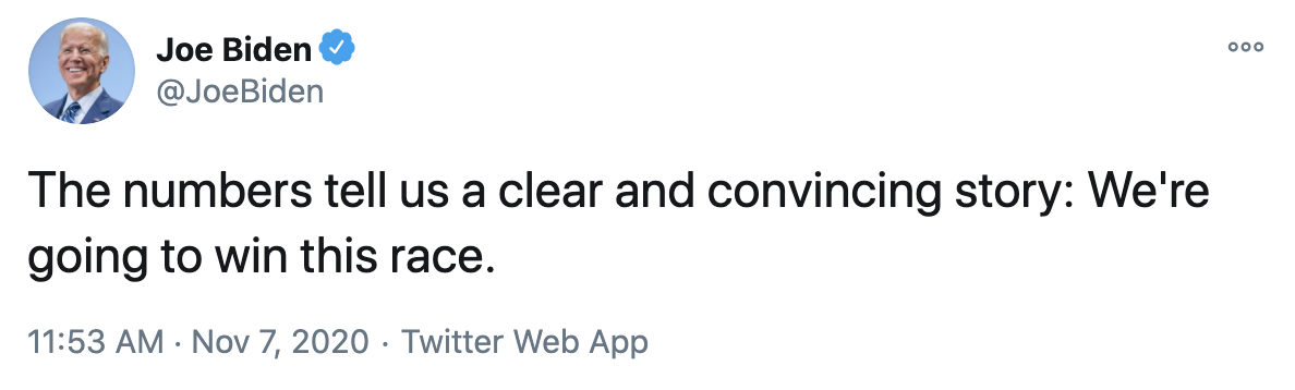 当地时间6日晚,美国前副总统、民主党总统候选人拜登在推特上发文称,数字已清晰且有说服力地告诉我们:我们将赢得这场选举。