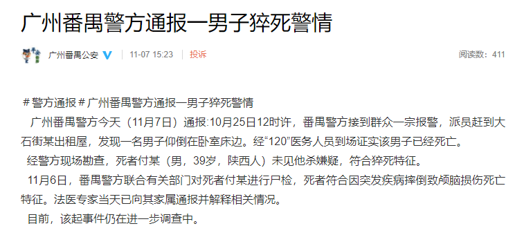 @广州番禺公安 微博11月7日通报,10月25日12时许,番禺警方接到群众一宗报警,派员赶到大石街某出租屋,发现一名男子仰倒在卧室床边。经“120”医务人员到场证实该男子已经死亡。
