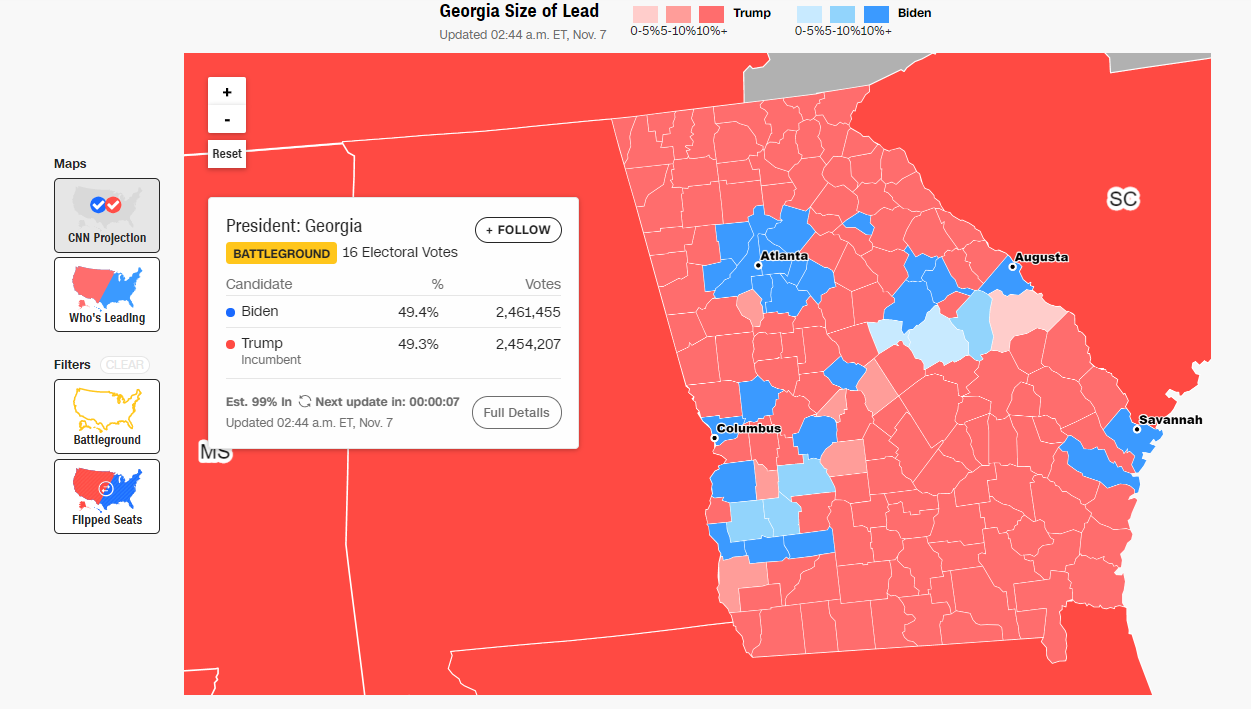 据美国有线电视新闻网(CNN)等美国媒体按照当下开票预测,截至北京时间7日16时20分左右,拜登在佐治亚州暂时领先特朗普7248票。